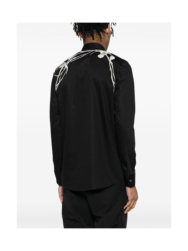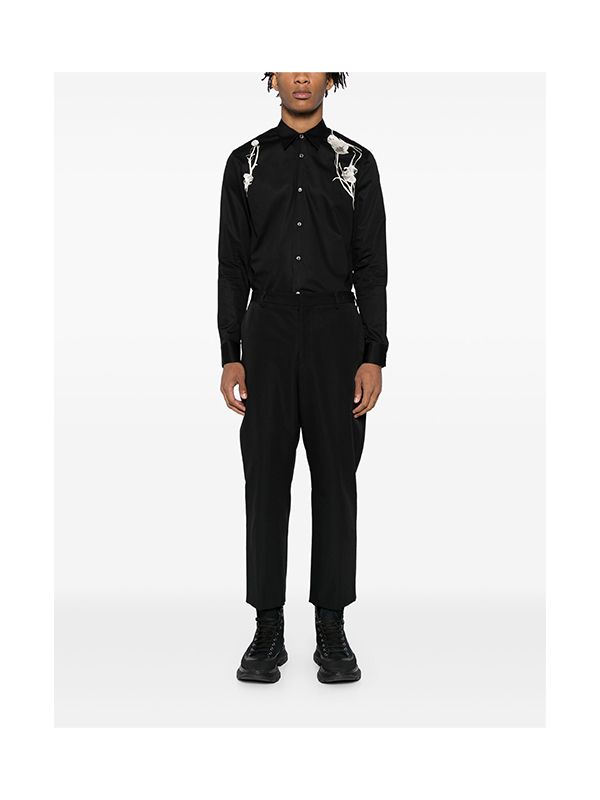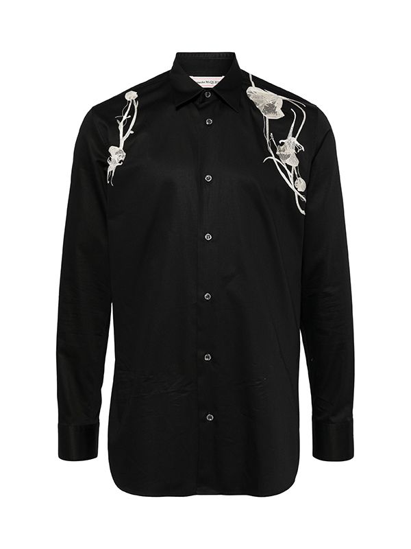 Poplin texture, floral embroidery, classic collar, front button fastening, long sleeves, buttoned cuffs, curved hem.