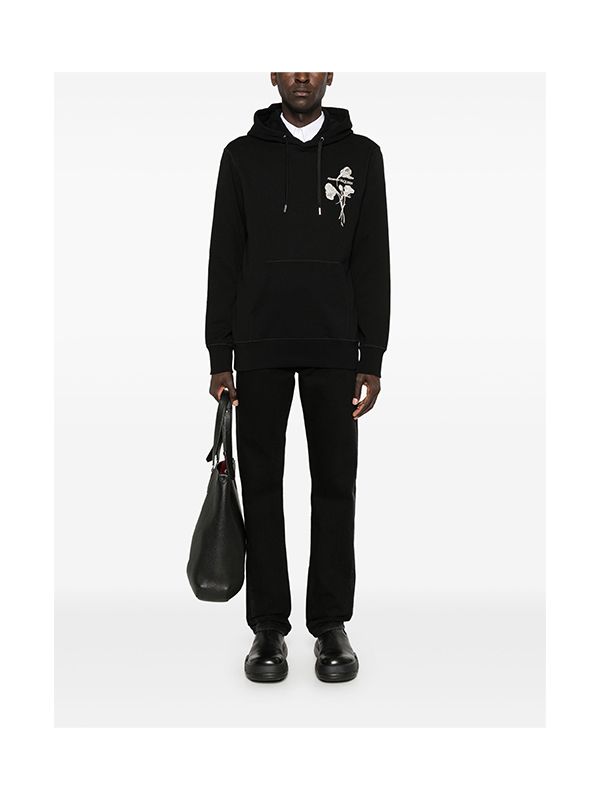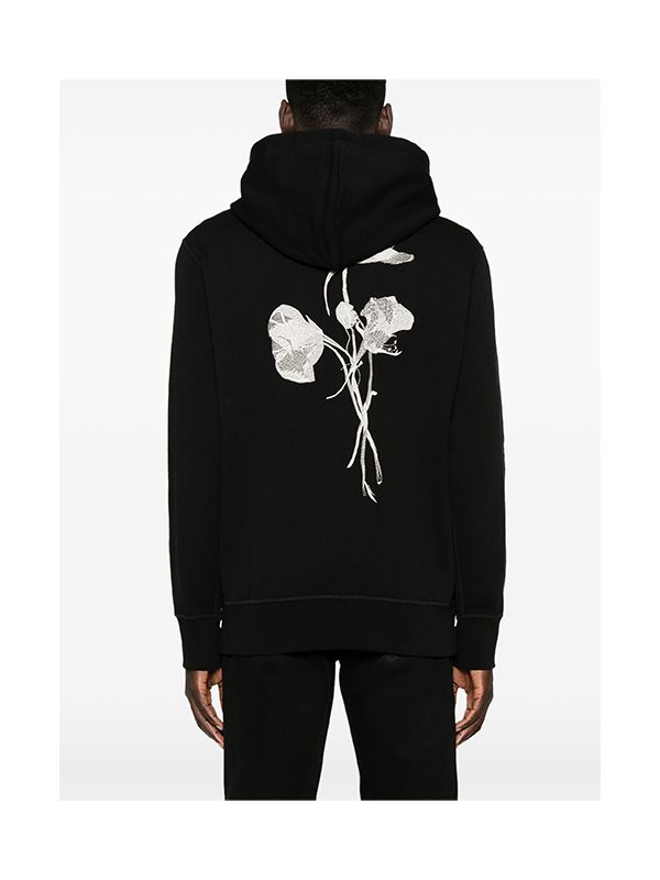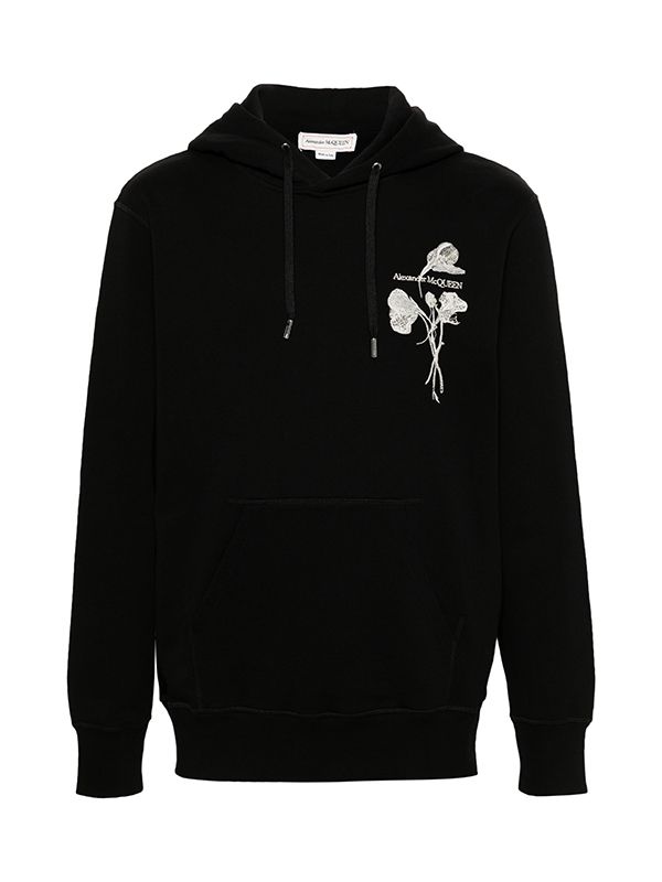 Jersey texture, slouchy drawstring hood, embroidered logo at the chest, floral embroidery, front pouch pocket, long sleeves, ribbed cuffs and hem, French terry lining