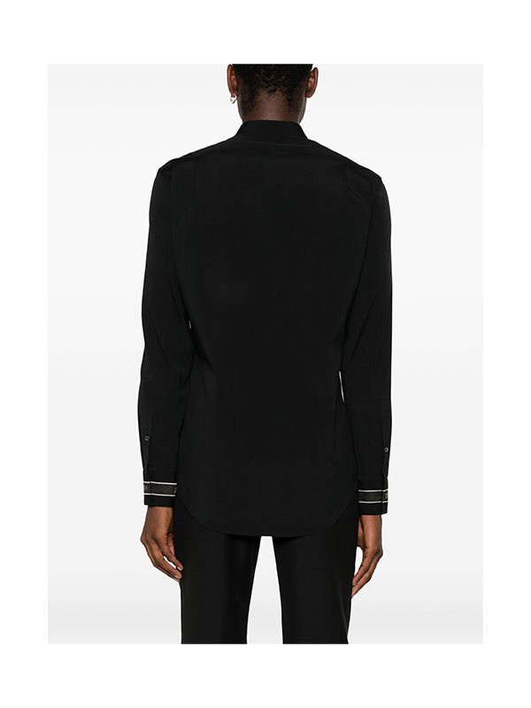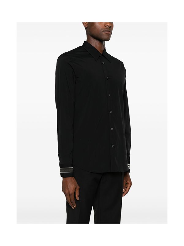 Poplin texture, logo-print strap, classic collar, long sleeves, buttoned cuffs, curved hem, front button fastening.