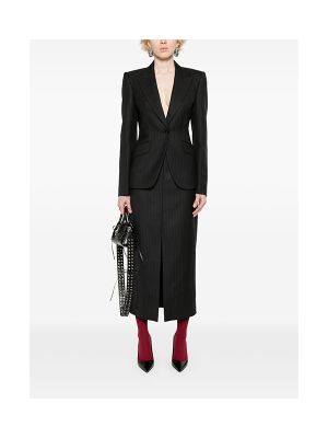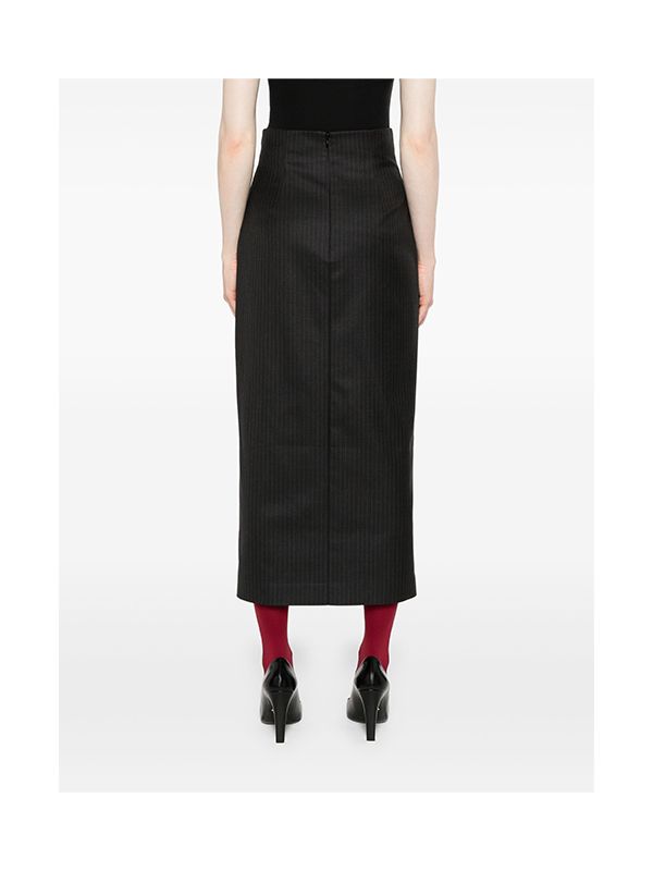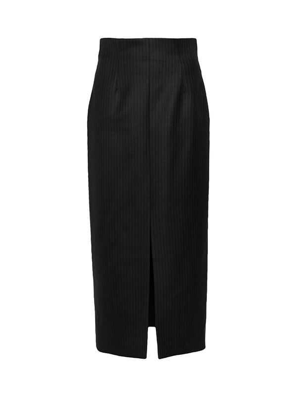 Pinstripe pattern, high waist, front slit, mid-calf length, straight hem, full lining, concealed rear hook and zip fastening.