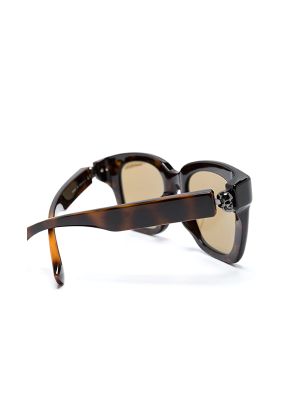 Tortoiseshell effect, square frame, skull appliqué, yellow tinted lenses, nose pads, straight arms, curved tips.
