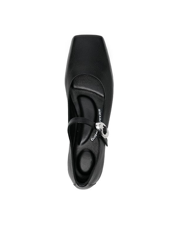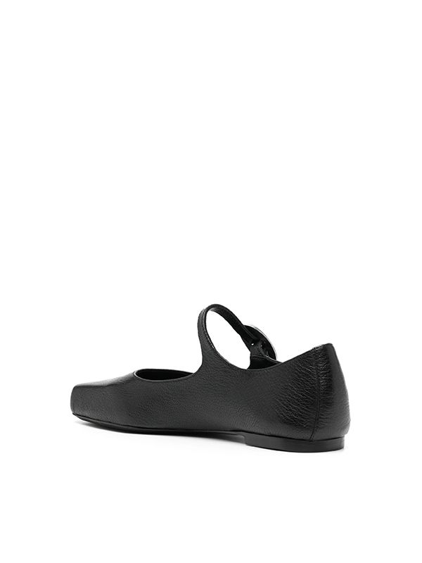 Pebbled texture, silver-tone logo engraved buckle strap fastening, square toe, leather lining, branded footbed, leather sole.