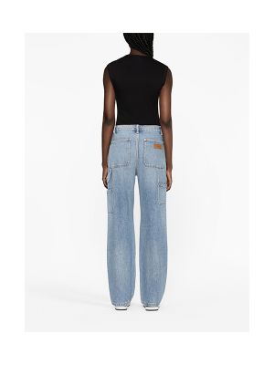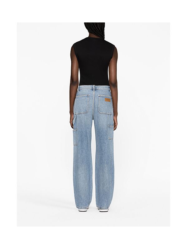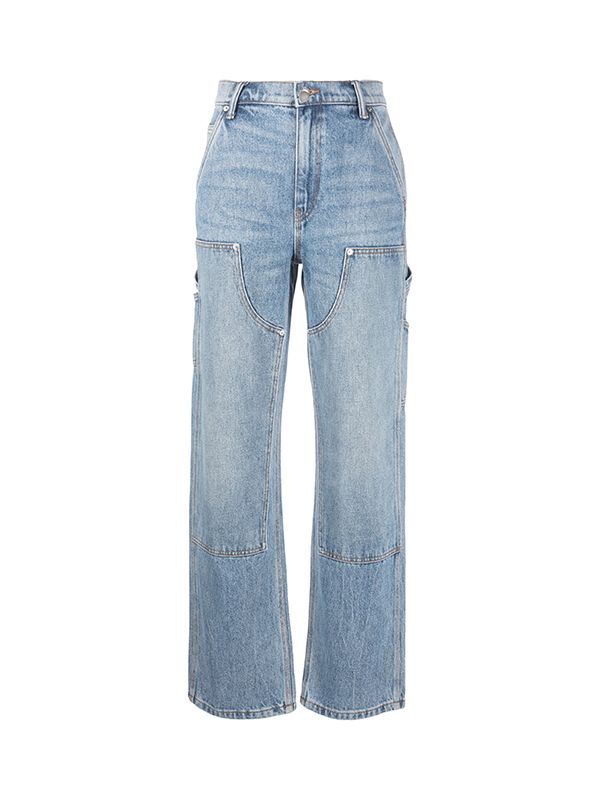 Washed denim, mid-rise, front button and zip fastening, hammer loop, two side inset pockets, carpenter side pockets, two rear patch pockets, straight leg.