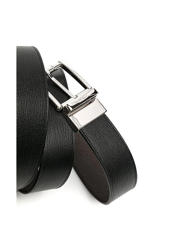 Silver-tone hardware, punched holes, front buckle fastening, adjustable fit.