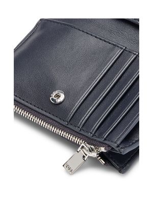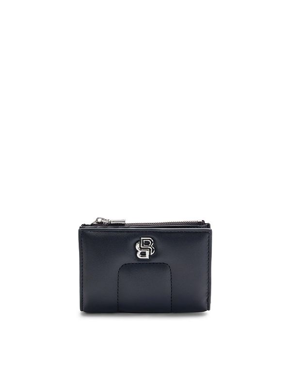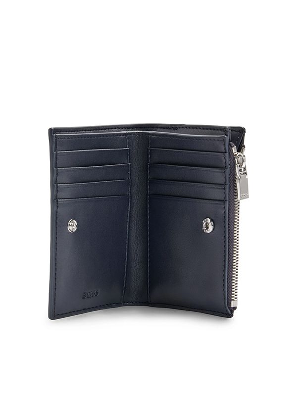 Faux leather, smooth grain, bi-fold design, press-stud fastening, silver-tone logo plaque, zip-fastening pocket, branded zip puller.