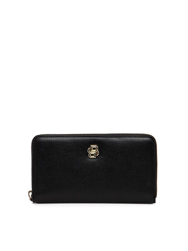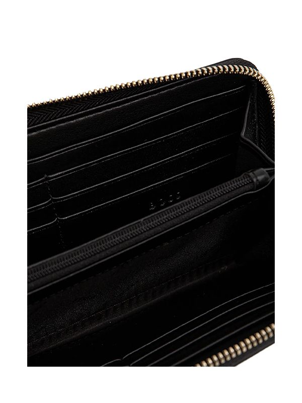 All-around zip fastening, internal zip-fastening pocket, internal card slots, gold-tone hardware.