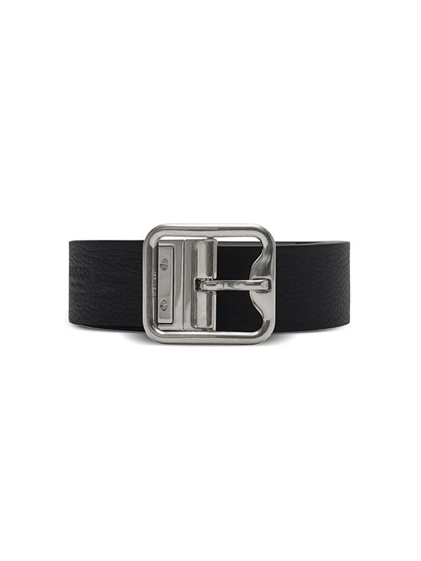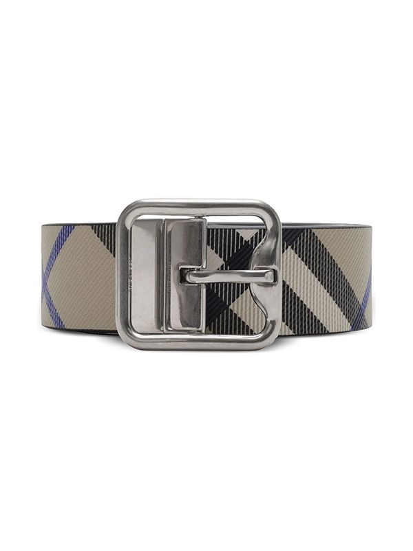 Check pattern, silver-tone buckle fastening, engraved logo, punched holes, adjustable fit, reversible.