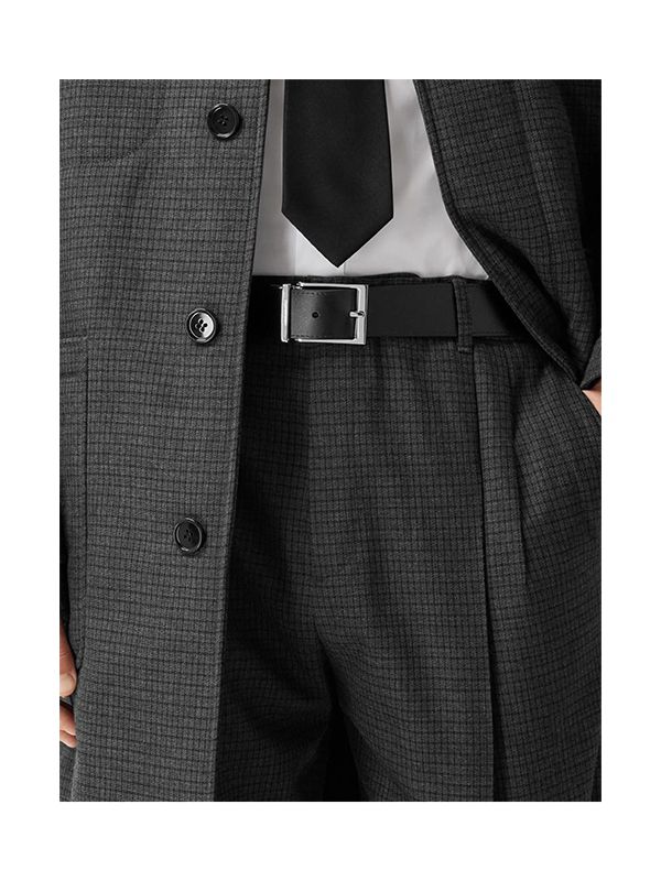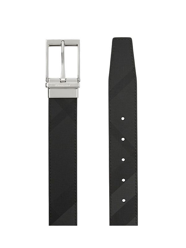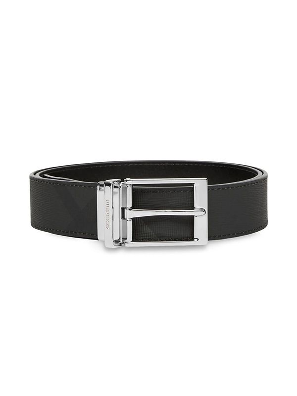 Check pattern, silver-tone buckle fastening, engraved logo, punched holes, adjustable fit, reversible.