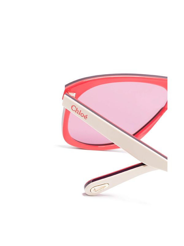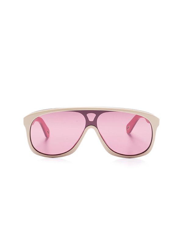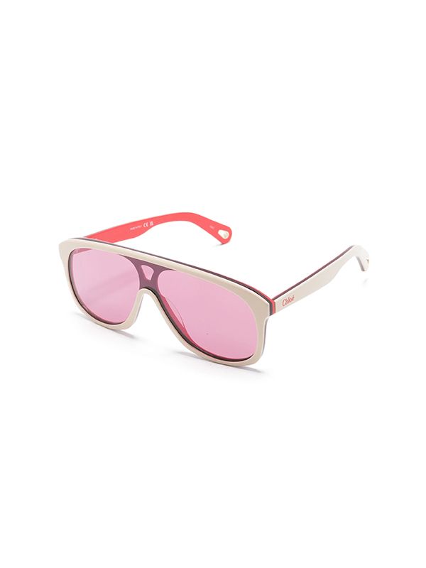 Shield frame, pink tinted lenses, UV protection, logo-engraved arm, straight arms, curved tips.