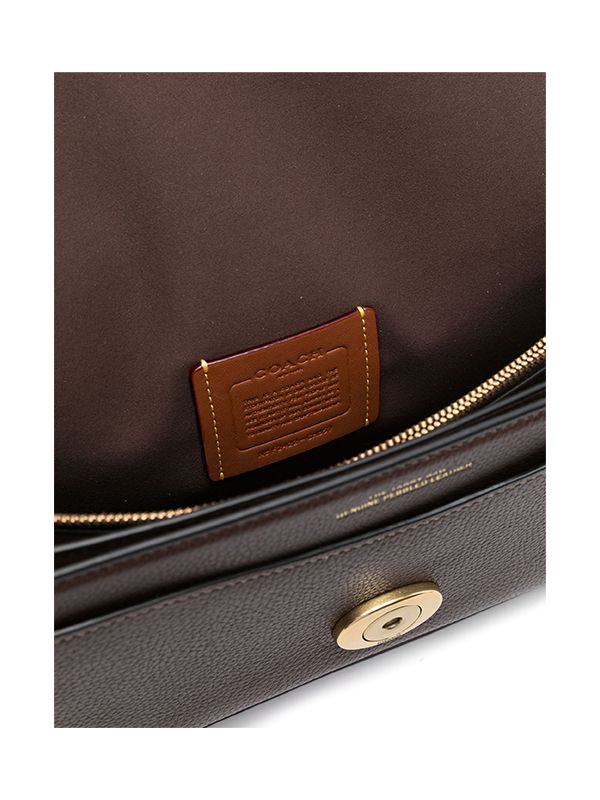 Fold over top with magnetic fastening, pebbled texture, single detachable top handle, adjustable detachable shoulder strap, logo plaque, slip pocket to the rear, partitioned compartment, internal zip-fastening pocket, internal patch pocket.