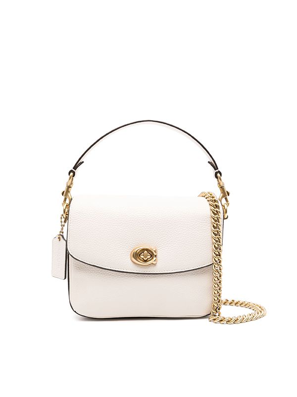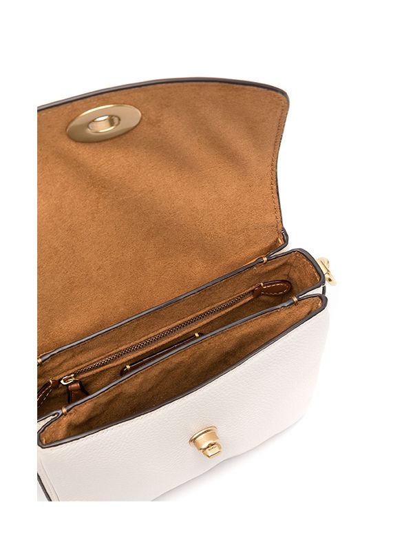Fold over top with twist-lock fastening, detachable chain-link top handle, grained texture, single detachable top handle, adjustable detachable shoulder strap, slip pocket to the rear, partitioned compartment, internal logo patch, internal zip-fastening pocket, suede lining, gold-tone hardware.