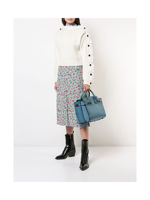 Detailed with a statement double-turn lock hardware, crafted from smooth glove tanned leather and suede with an outside slip pocket, detachable and adjustable strap for shoulder drop or crossbody, features round top handles, a top zip closure and a main internal compartment.