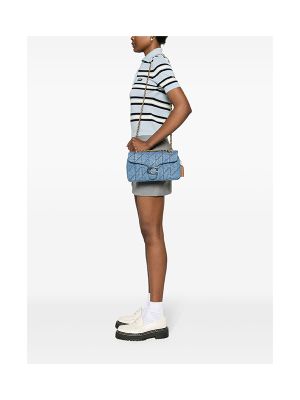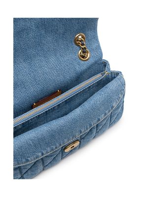 Fold over top with clasp fastening, denim, quilted, logo plaque at the front, branded logo tag to the side, contrast stitching, sliding chain-link shoulder strap, partitioned compartment, internal flap pocket, internal zip-fastening pocket, internal logo patch, full lining, gold-tone hardware.