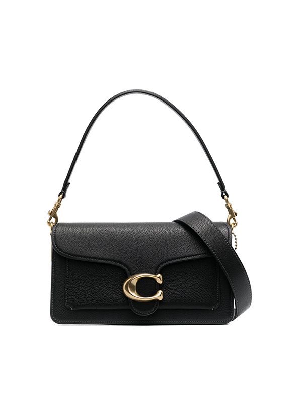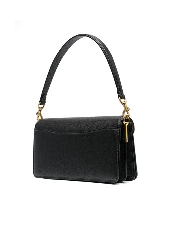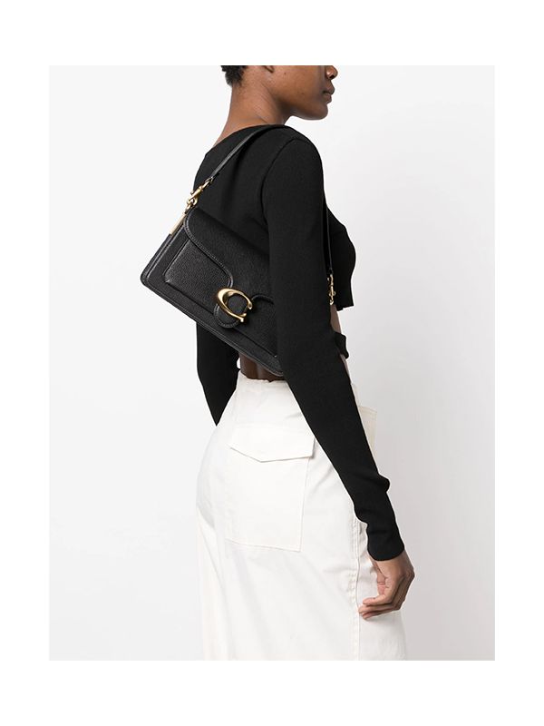 Fold over top, detachable shoulder strap, pebbled texture, gold-tone logo plaque, partitioned compartment, internal zip-fastening pocket.