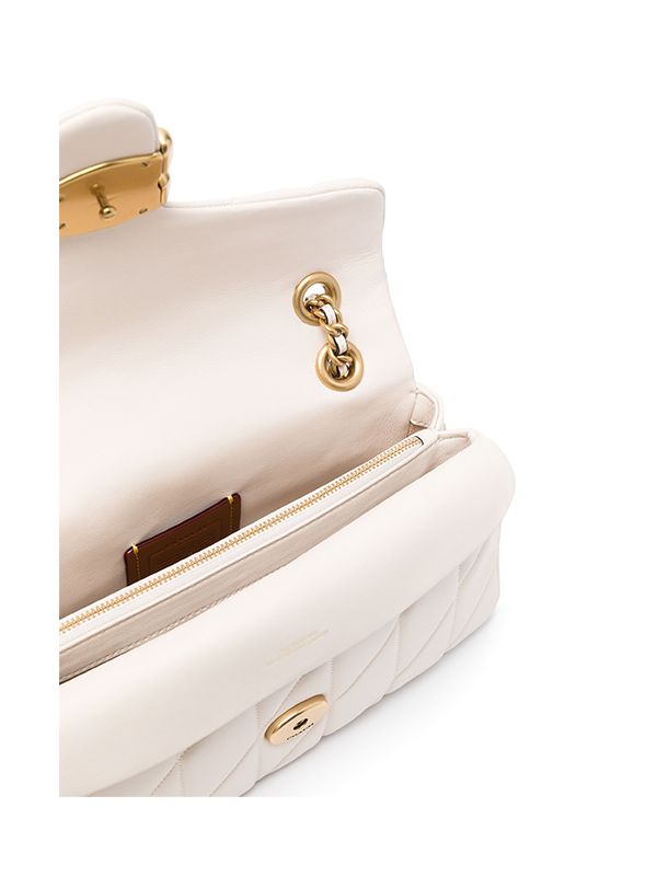 Fold over top with press-stud fastening, padded design, quilted, leather and chain-link shoulder strap, gold-tone logo plaque, rear magnetic-fastening pocket, logo tag, partitioned compartment, internal flap pocket, internal zip-fastening pocket, internal logo patch, full lining, gold-tone hardware.