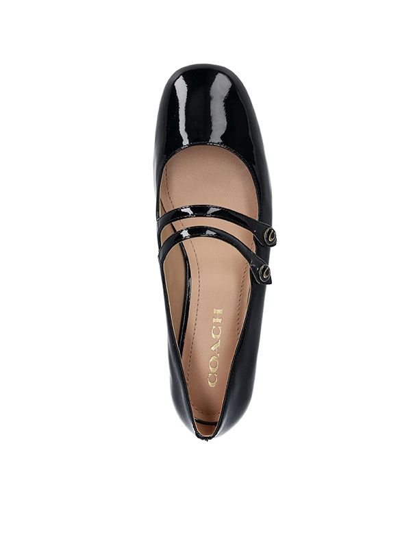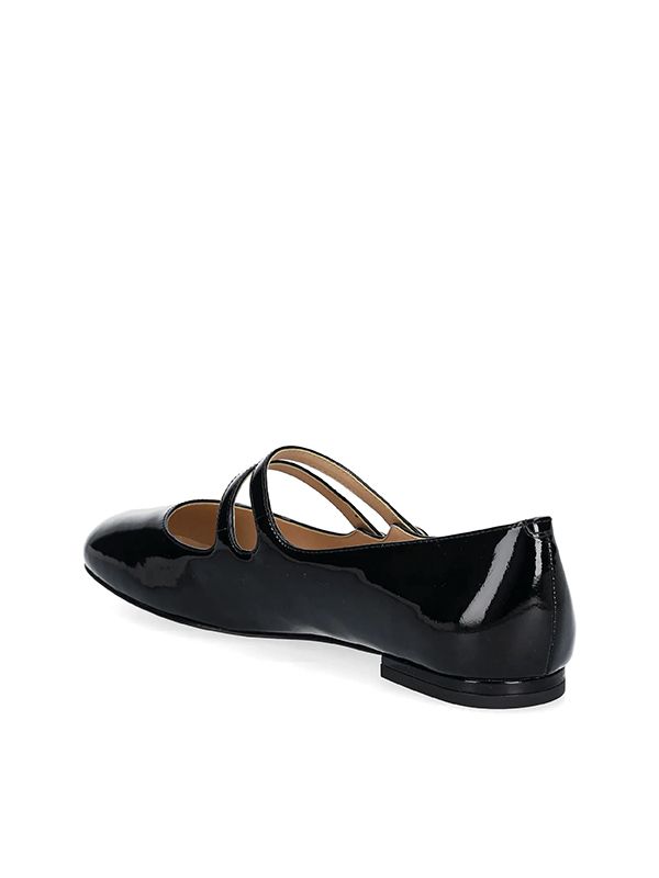 Double-strap design, press-stud fastening, round toe, patent finish.