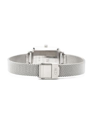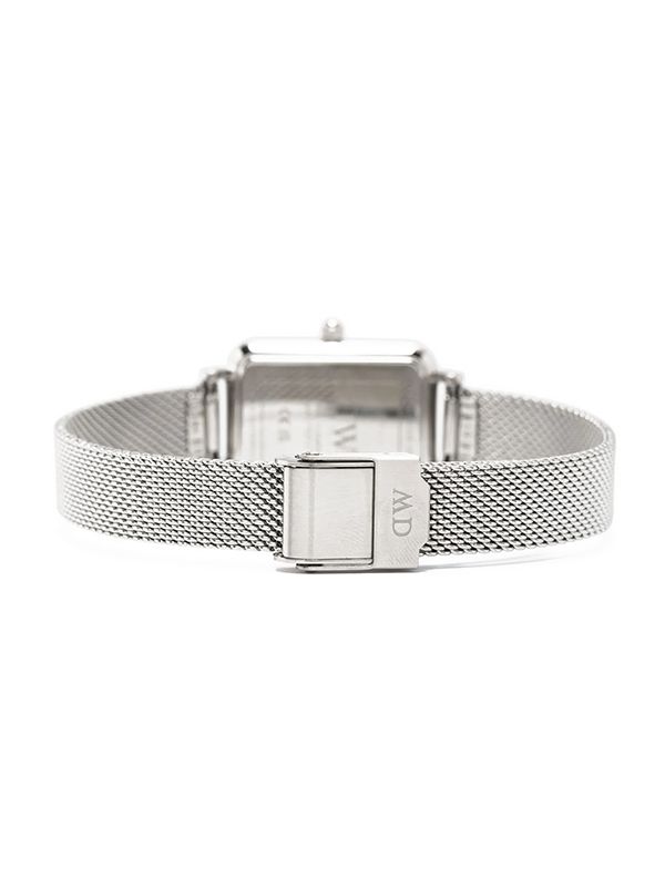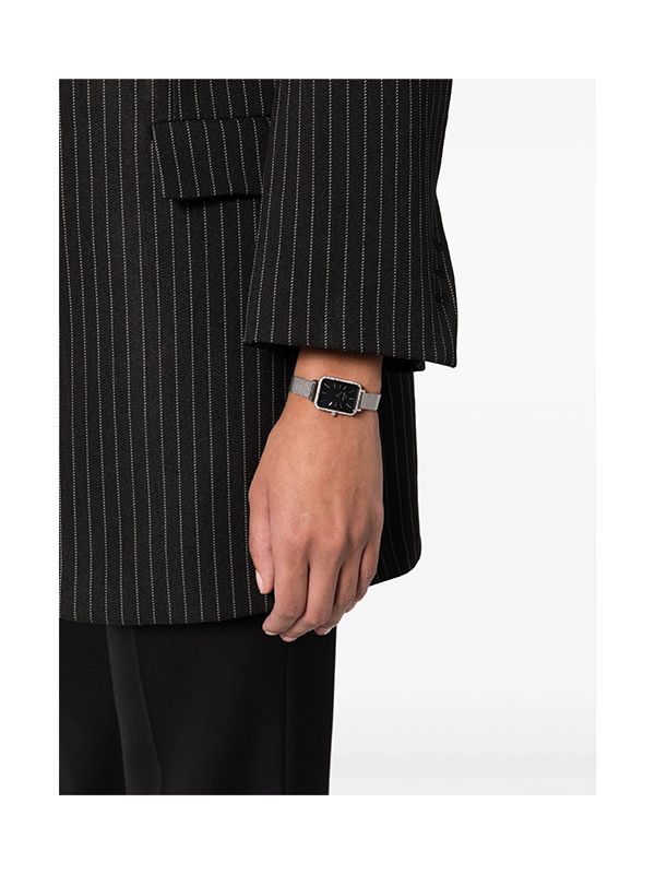 Stainless steel case, quartz movement, black, baton dial, baton hands, square face, crystal-encrusted bezel, stainless steel mesh bracelet, folding clasp, water resistance up to 30m/3 ATM.