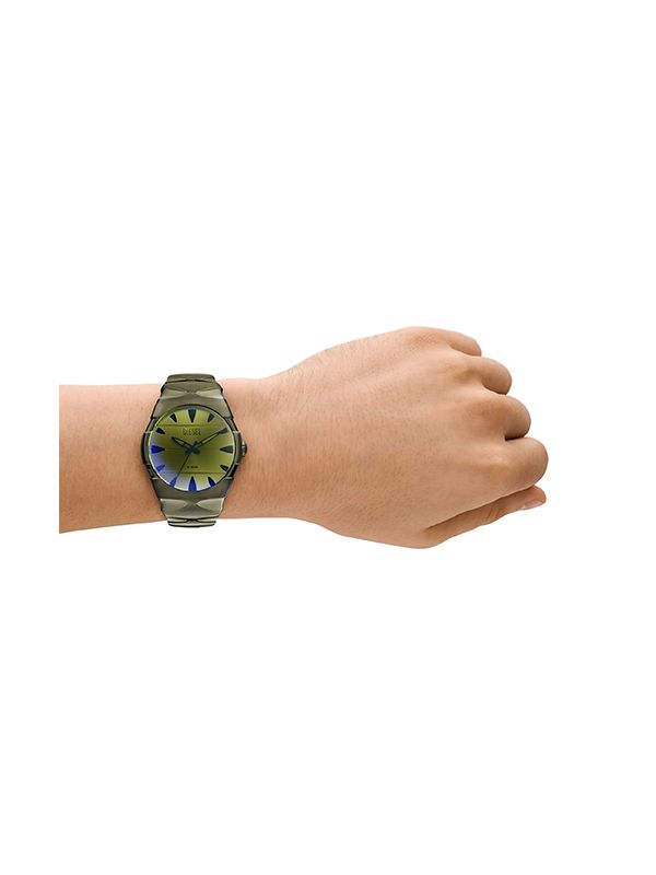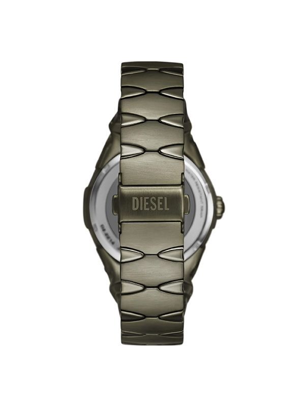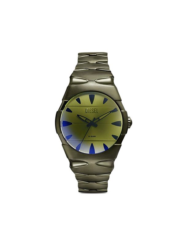 42mm, stainless steel case, quartz movement, round face, sunray-patterned dial, baton hands, screw-down crown, stainless steel link bracelet, water resistance up to 50m/5 ATM, folding clasp.