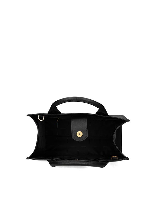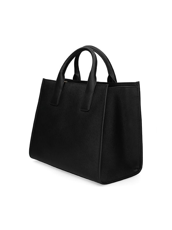 Magnetic fastening, open top, two top handles, adjustable detachable shoulder strap, logo plaque.