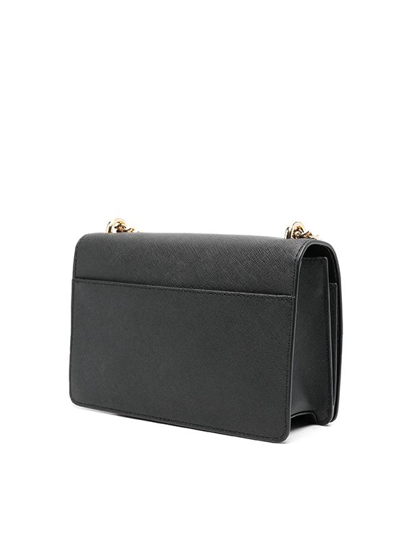 Fold over top, concealed magnetic fastening, Saffiano-texture panel, brushed-texture panel, logo lettering, rear slit pocket, adjustable leather and chain-link shoulder strap, partitioned compartment, internal zip-fastening pocket, internal card slots, gold-tone hardware.