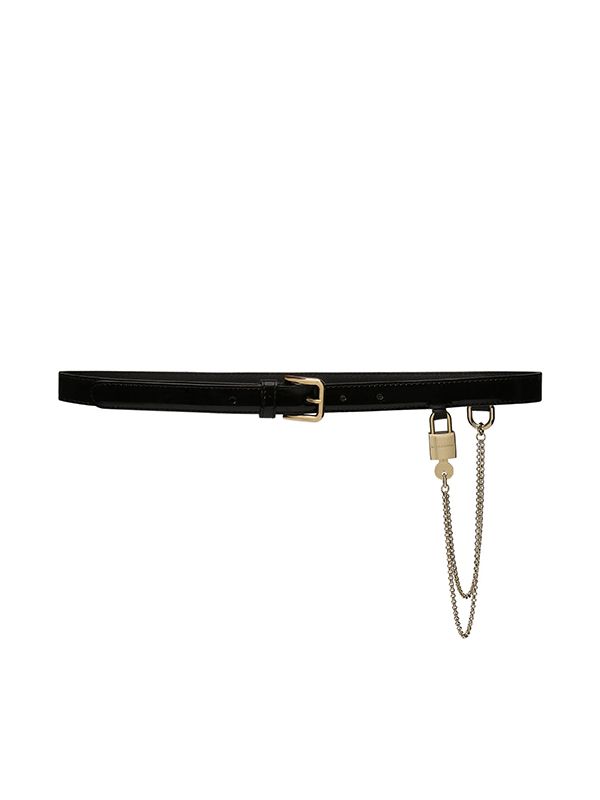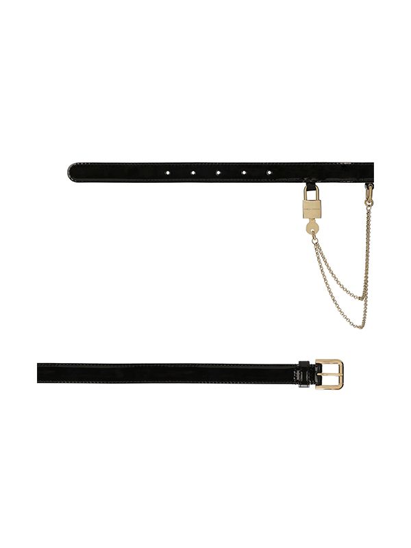 Engraved logo, patent finish, adjustable fit, keyring attachment, padlock detail, chain-link detailing.
