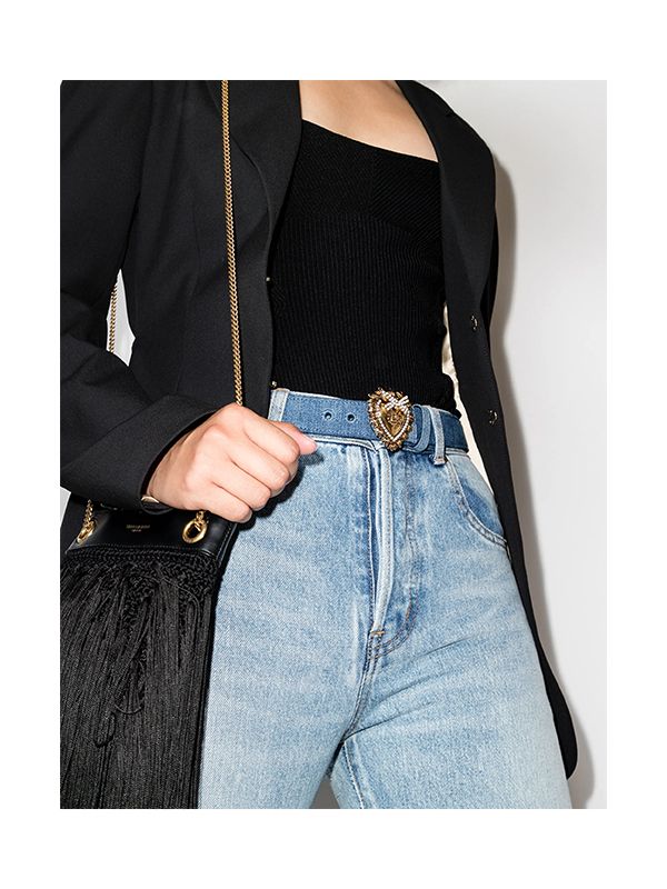 With the signature bejewelled heart, this Dolce & Gabbana denim belt will turn you into the master of accessorizing.