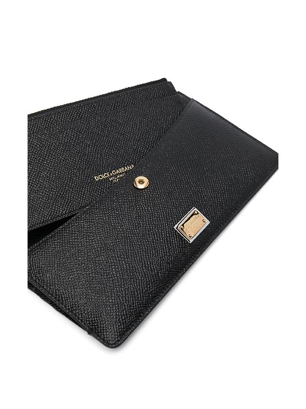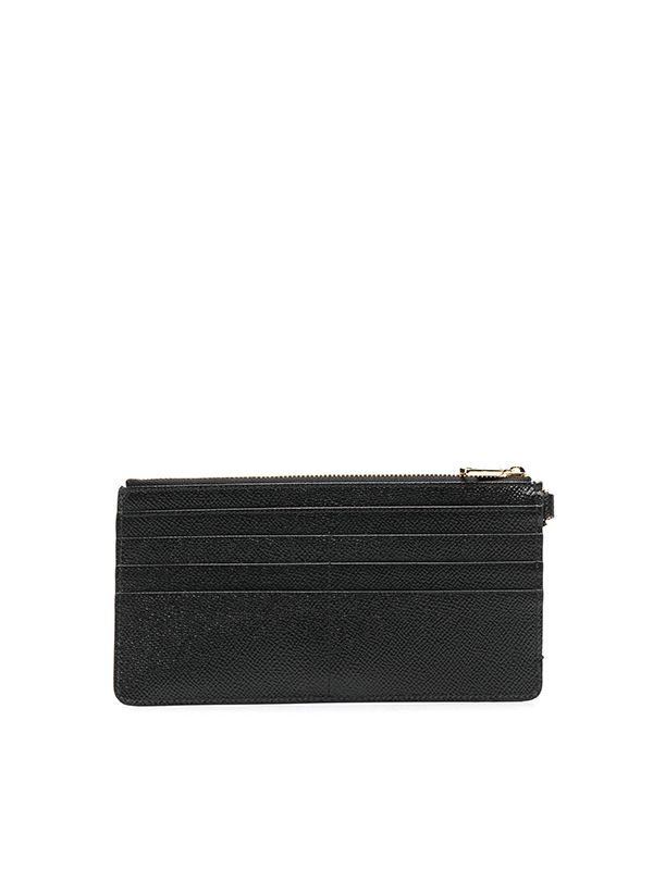 Top zip fastening, press-stud fastening, rear card slots, logo plaque.