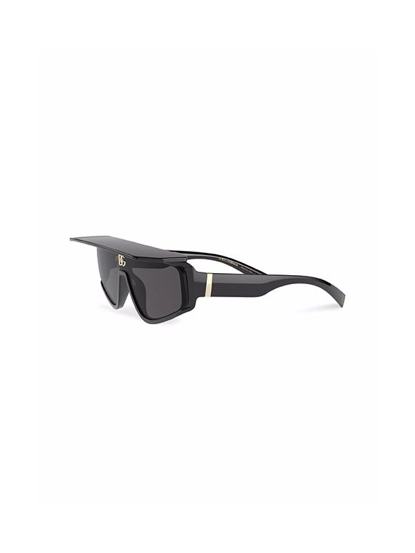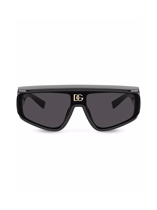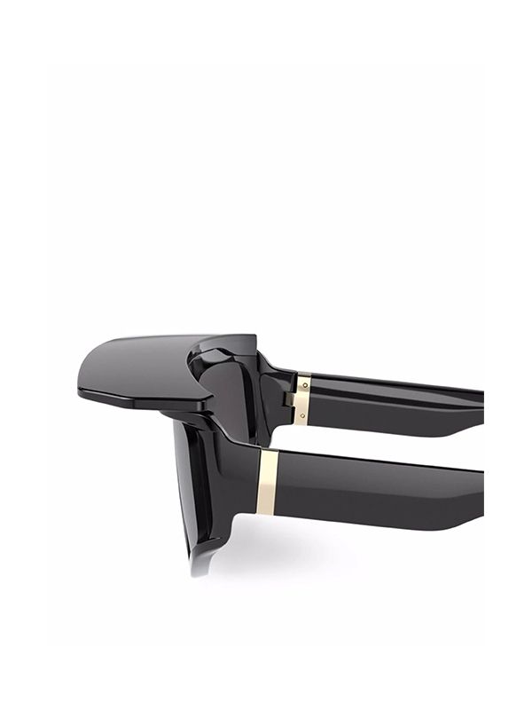 Gold-tone logo plaque, rectangle frame, tinted lenses, flat peak straight arms, curved tips.
