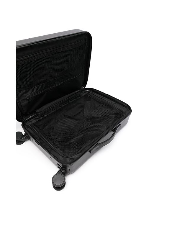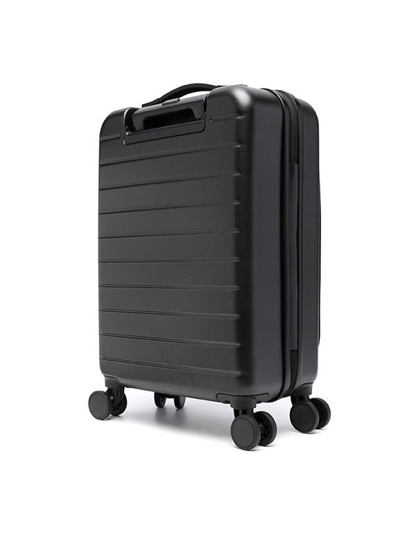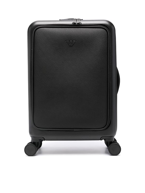 four wheels, front zip-fastening pocket, partitioned compartment.