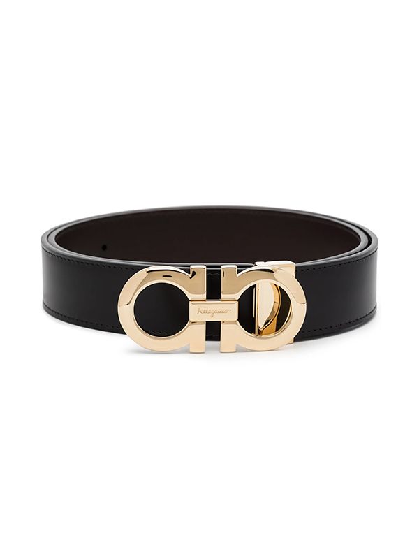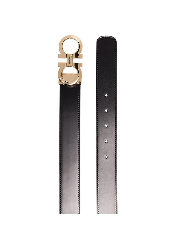 A large gold tone metal logo buckle, this piece features an adjustable length for a custom fit and a reversible leather belt.