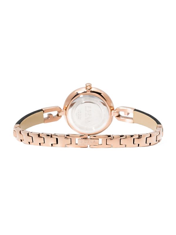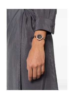 Stainless steel case, quartz movement, geometric dial, baton hands, black logo-patterned index dial, arch logo motif, round face, glass, screw-down crown, leather and stainless steel link bracelet, push-button folding clasp.