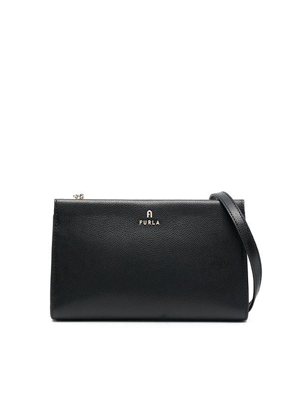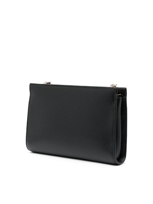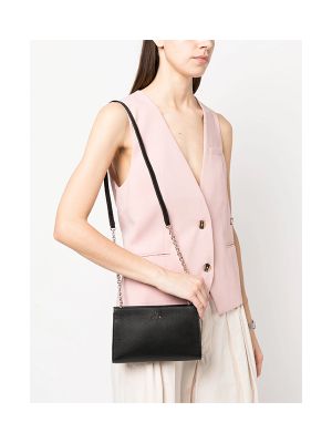 Top zip fastening, grained texture, gold-tone logo lettering, debossed internal logo, internal card slots, leather and chain-link shoulder strap.