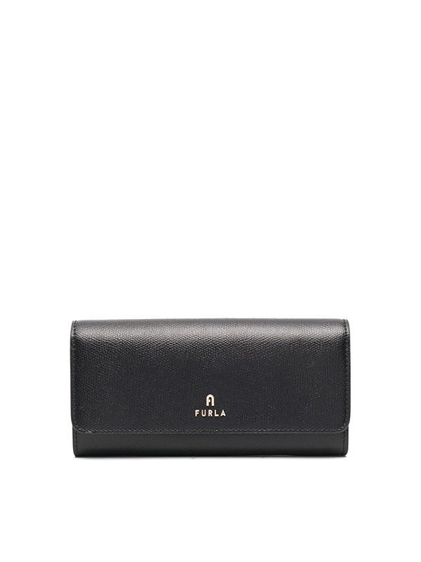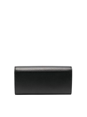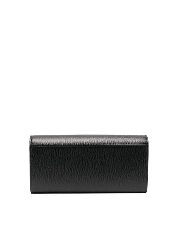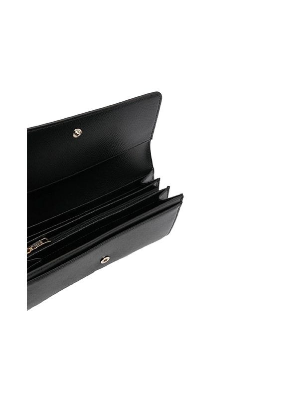 Grained texture, logo stamp to the front, fold over top with press-stud fastening, internal card slots, internal note compartments, coin pocket.