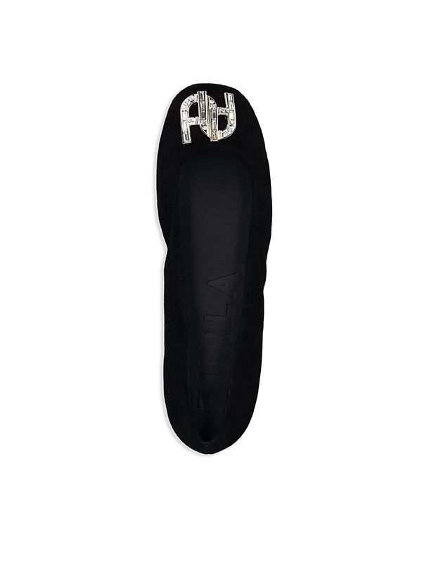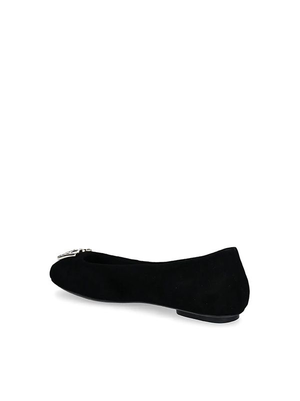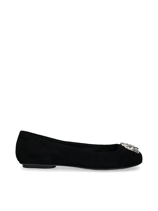 Slip-on style, gold-tone logo plaque, round toe, rubber sole.