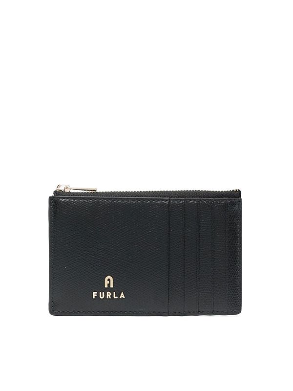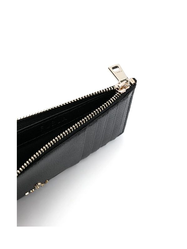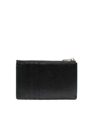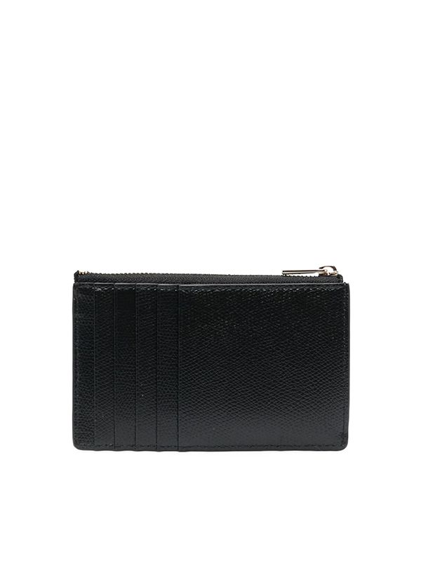 Gold-tone logo plaque, top zip fastening, rear card slots.