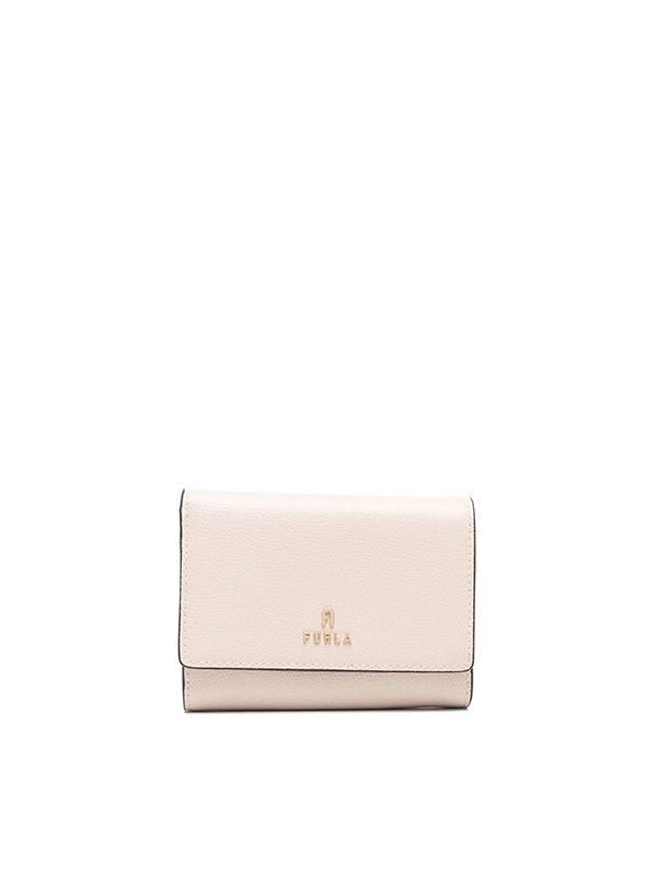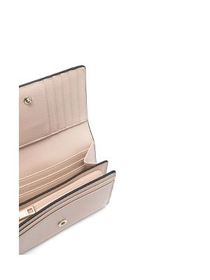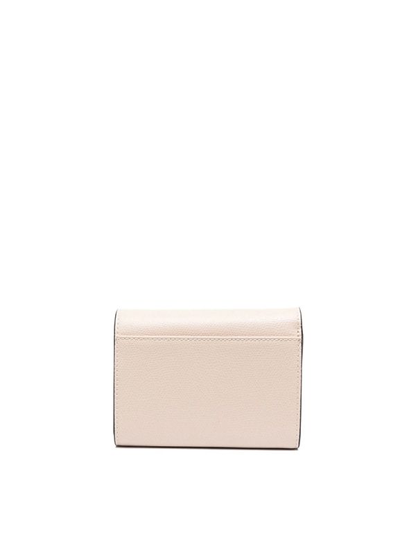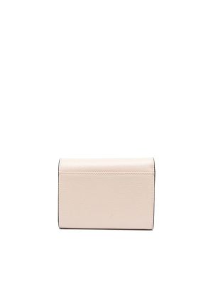 Grained texture, gold-tone logo lettering, gold-tone logo plaque, contrasting trim, fold over top with press-stud fastening, internal card slots, internal zip-fastening pocket.