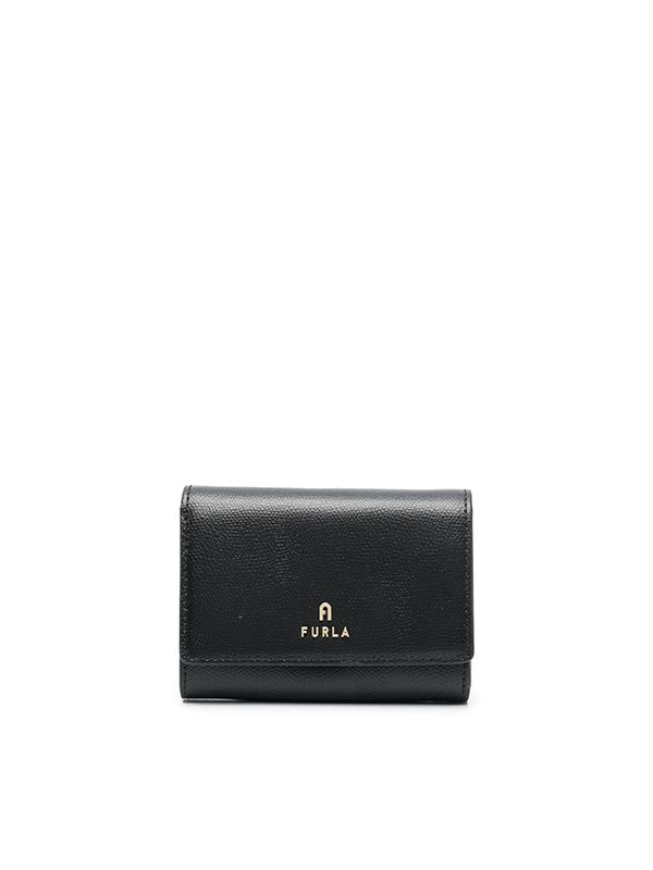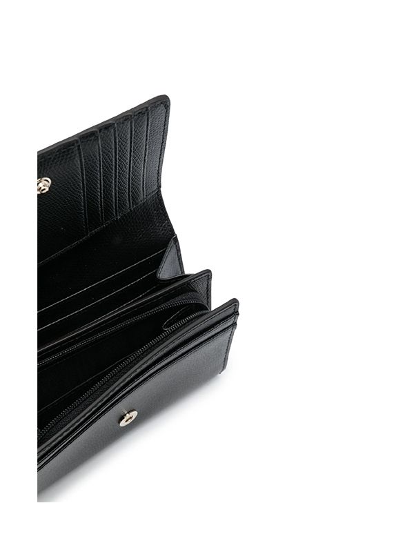 Pebbled texture, gold-tone logo lettering, gold-tone logo plaque, tonal stitching, fold over top with press-stud fastening, debossed internal logo, internal card slots, internal zip-fastening pocket.