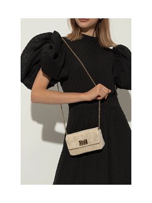 Turn-clasp fastening, metallic finish, brushed finish, chain-link shoulder strap, main compartment.