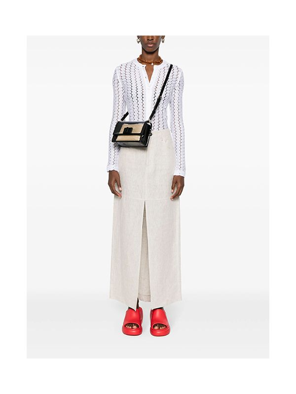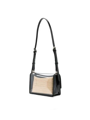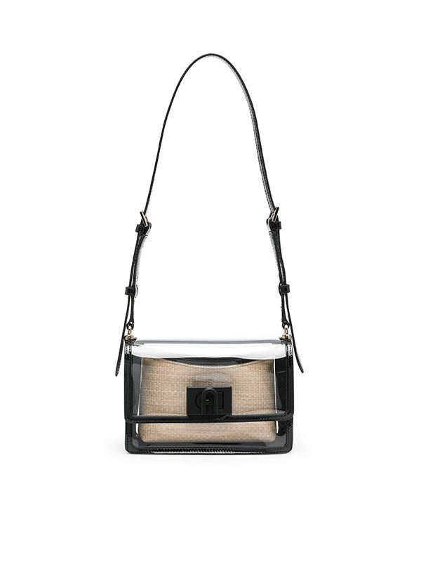 Fold over top with turn-clasp fastening, transparent design, Arch logo plaque, adjustable shoulder strap, removable pouch, internal logo patch, gold-tone hardware.