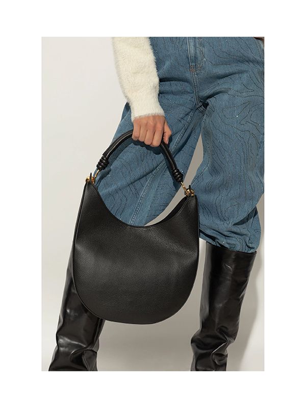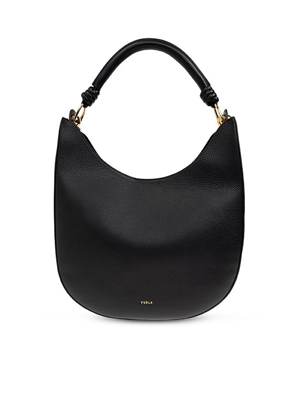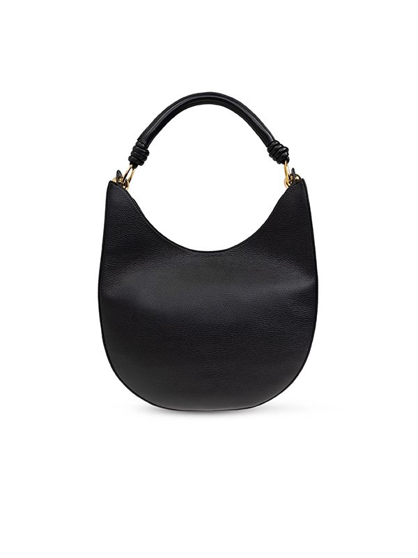 Magnetic fastening, grained texture, single top handle, knot detailing, gold-tone logo lettering, main compartment, internal logo patch, internal zip-fastening pocket.