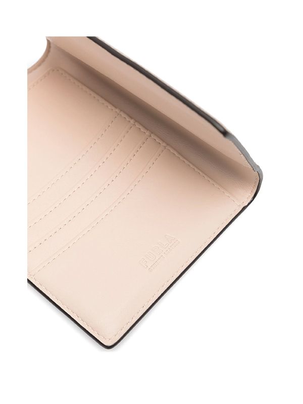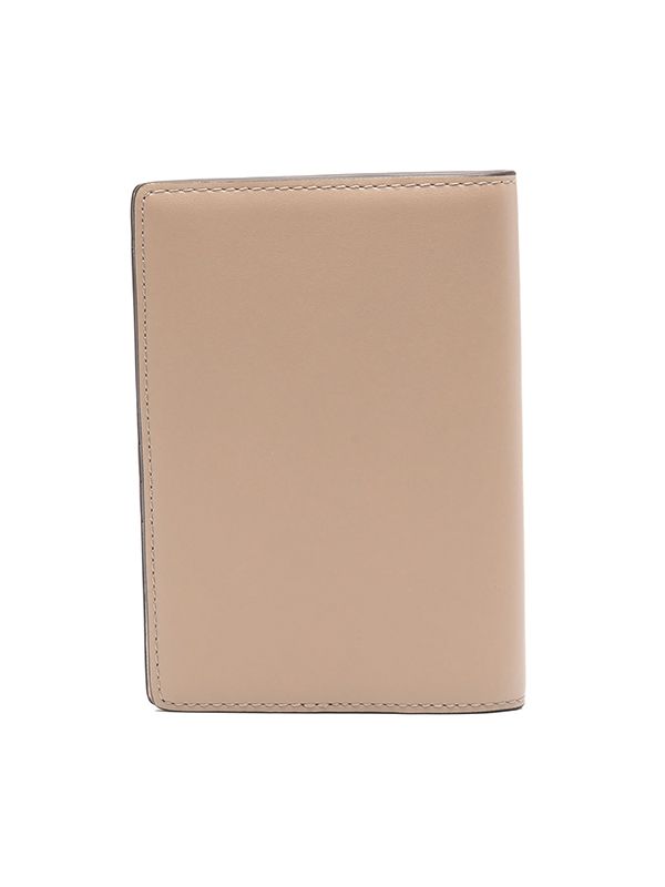 Gold-tone logo lettering, passport slot, internal card slots, internal note compartments, bi-fold design.