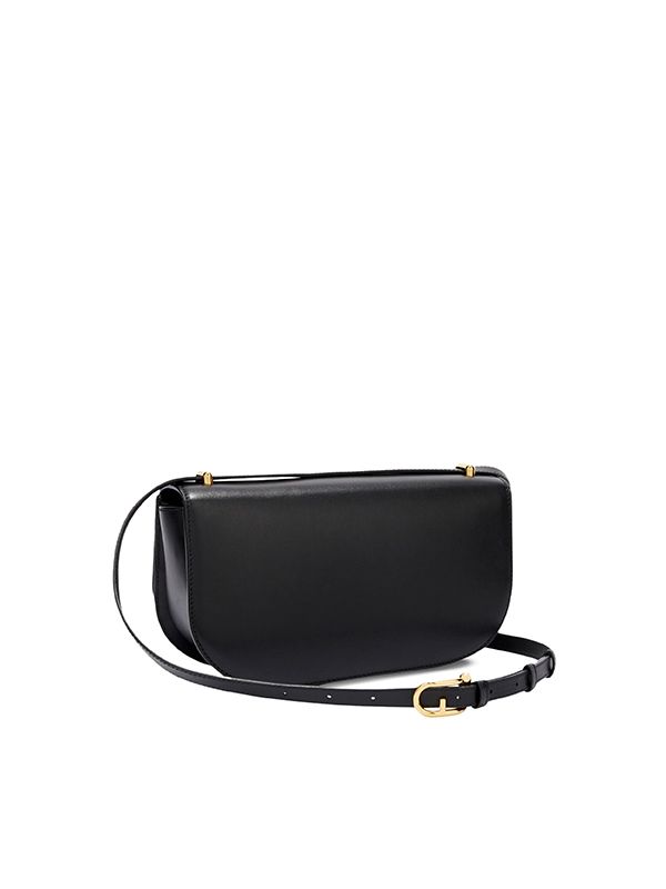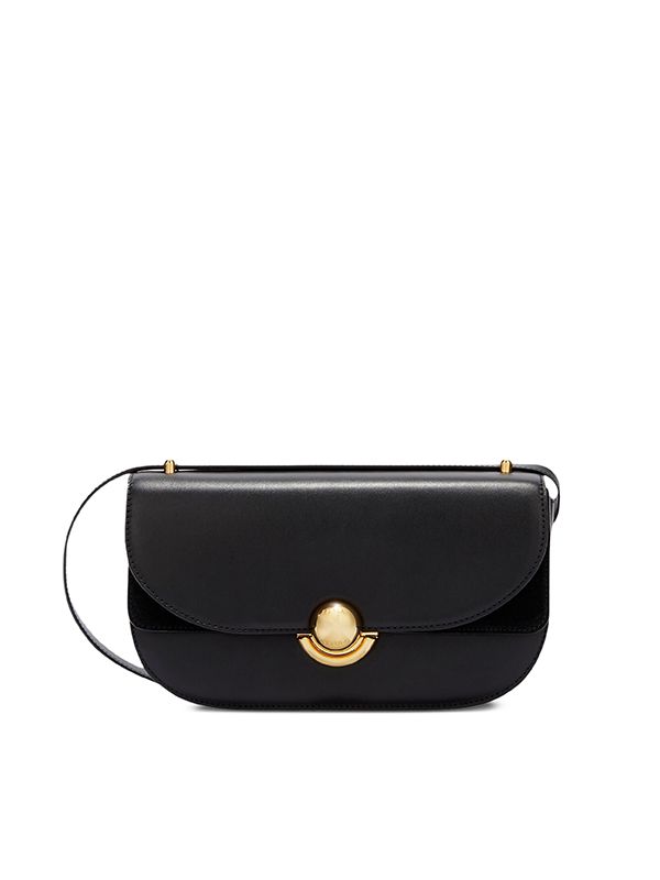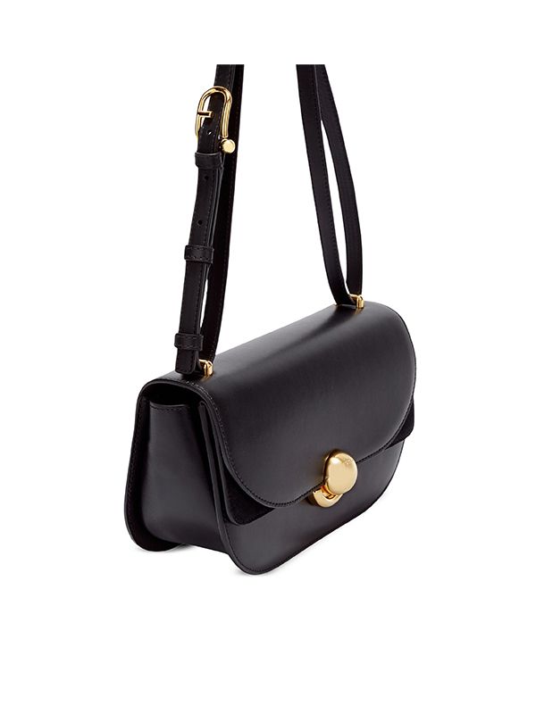 Fold over top, smooth grain, signature Sfera closure, adjustable detachable shoulder strap, suede lining, partitioned compartment, internal zip-fastening pocket, internal logo patch.