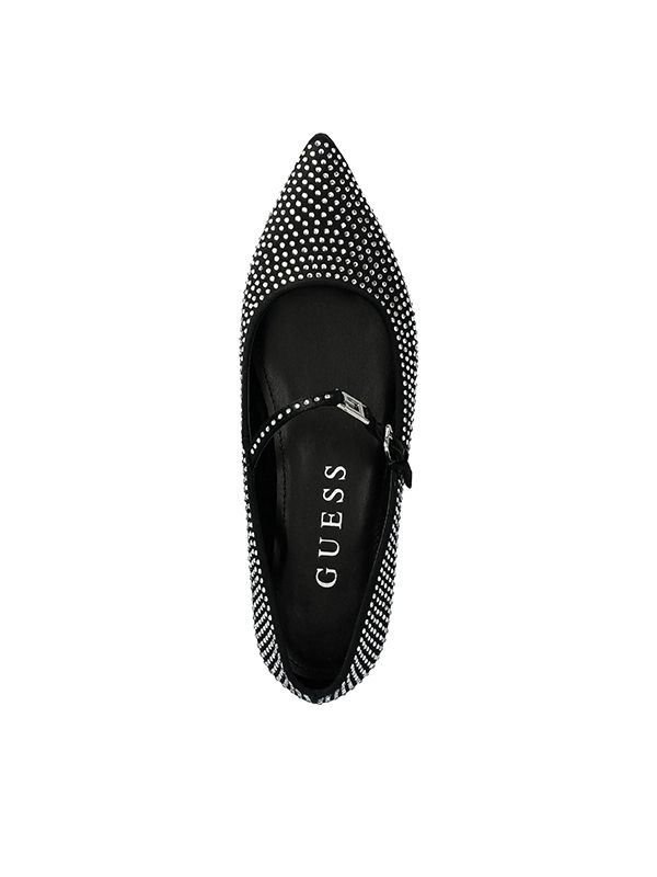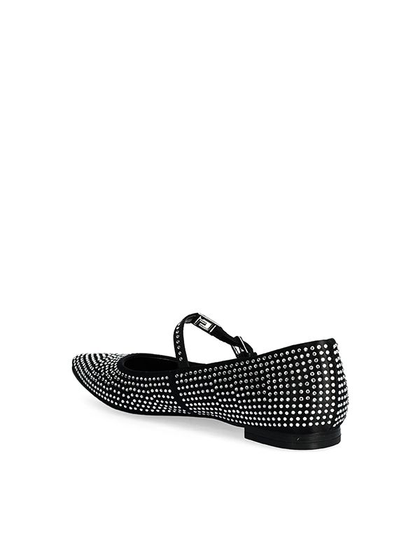 Buckle-strap fastening, flat rubber sole, rhinestone embellishment, branded insole.
