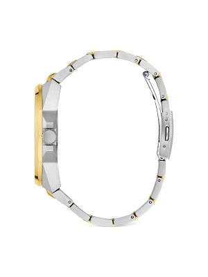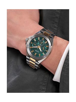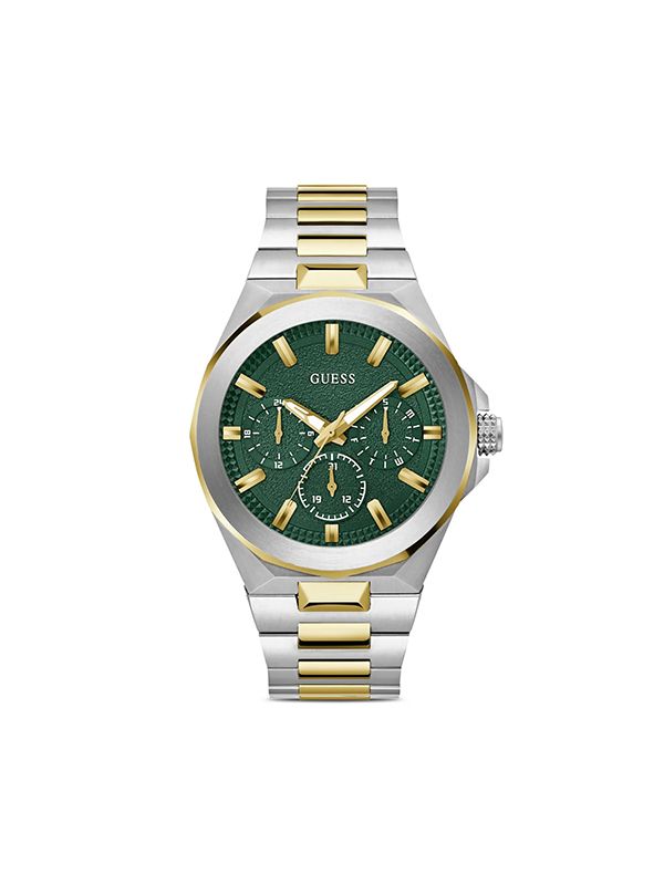 46mm, index dial, stick hands, chronograph counters, round face, mineral glass, centre-dent crown, adjustable link bracelet, folding clasp.