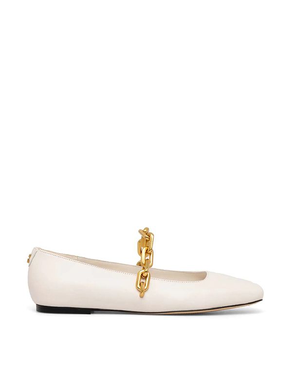 Slip-on style, flat rubber sole, chain-link detailing, square toe.