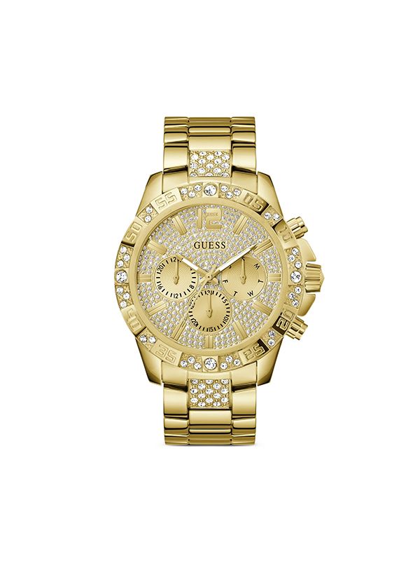 48mm, round face, crystal embellishment, digital–analogue display, chronograph counters, mineral glass, stainless steel link bracelet, folding clasp, water resistance up to 50m/5 ATM.