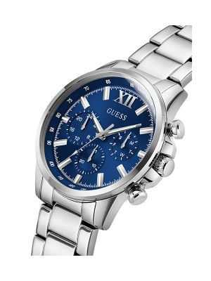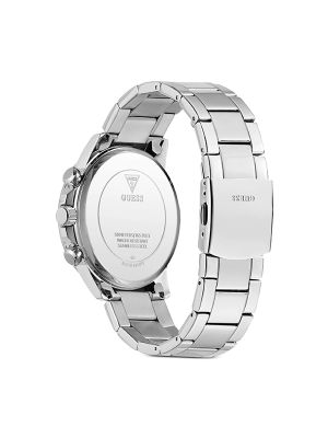 44mm, polished finish, round face, chronograph counters, fixed tachymeter bezel, geometric dial, stick hands, screw-down crown, two chronograph pushers.