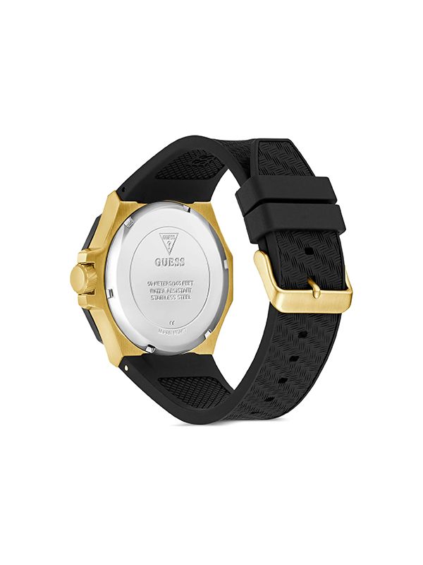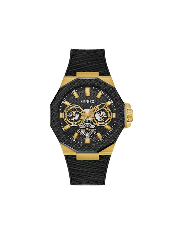 45mm, round face, geometric dial, chronograph counters, pin-buckle fastening, water resistance up to 50m/5 ATM.
