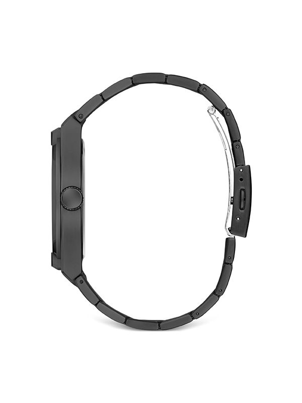 44mm, matte finish, round face, guilloché dial, Arabic dial, baton hands, battery-operated movement, screw-down crown, adjustable link bracelet, folding clasp.