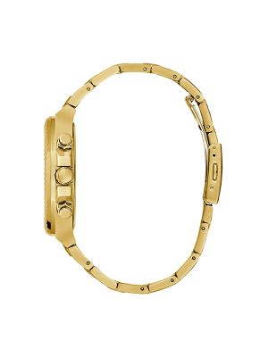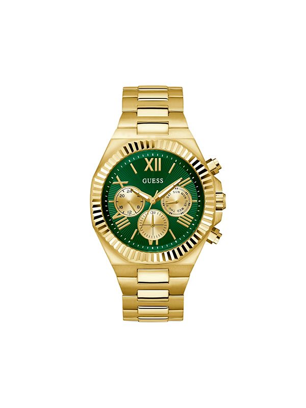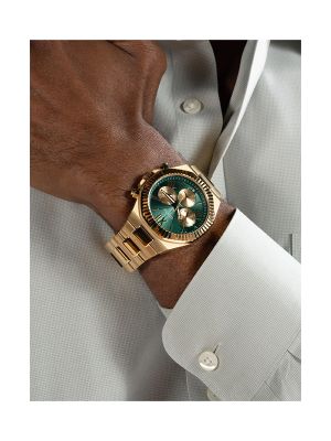 36mm, gold-tone, round face, Roman numeral dial, baton hands, chronograph counters, date indication, battery-operated movement, two chronograph pushers, screw-down crown, adjustable link bracelet, folding clasp.